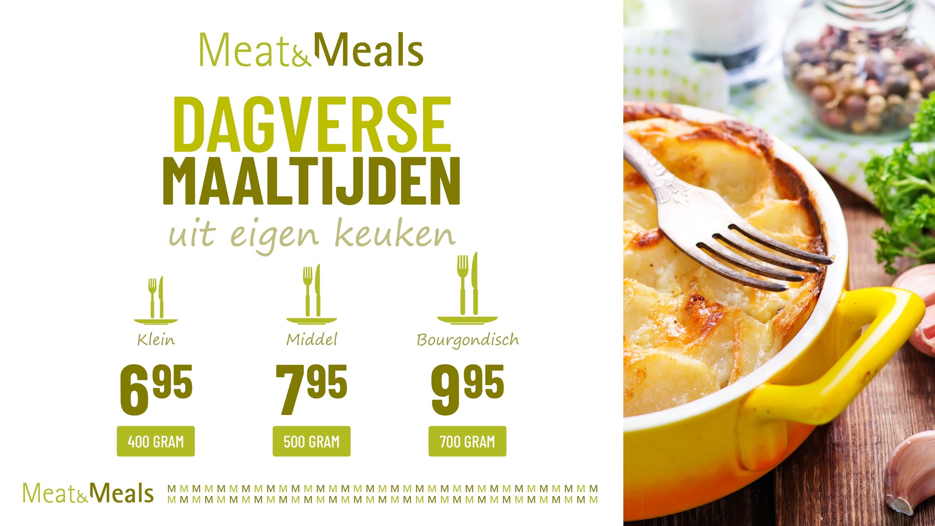 Dagverse ingrediënten en een flinke dosis liefde zorgen er voor dat u bij Meat&Meals dagelijks de heerlijkste maaltijden kunt bestellen. Door gebruik te maken van producten die seizoensgebonden zijn, houden wij de kosten voor u laag én heeft u de keuze uit een afwisselend assortiment aan gezonde avondmaaltijden. Wij bereiden dagelijks kant-en-klaar maaltijden uit de Hollandse, Italiaanse of Oosterse keuken.
